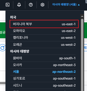 우측 상단에서 리전을 "버지니아 북부"로 변경해줍니다.