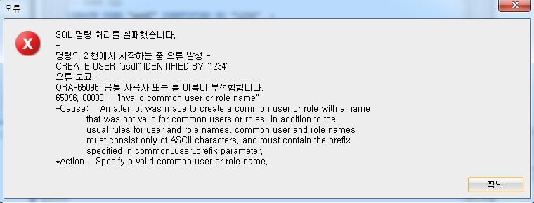 오라클 계정 생성 시 아래 사진처럼 "ORA-65096: 공통 사용자 또는 롤 이름이 부적합 합니다." 또는 "ORA-65096: invalid common user or role name" 에러가 발생하는것을 쉽게 볼 수 있습니다.