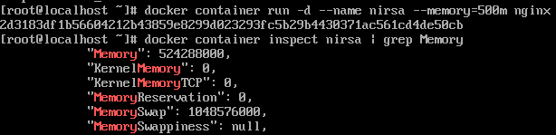 아래 명령어는 nginx 이미지를 사용해 컨테이너 nirsa 를 생성하면서 시작하되, 메모리 사용량은 500mb로 제한 합니다. 메모리를 제한할때는 b, k, m, g (바이트, 킬로바이트, 메가바이트, 기가바이트) 가 사용 됩니다.