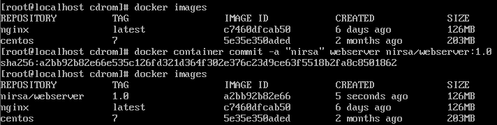 기존에 사용중이던 컨테이너를 사용하여 이미지를 생성할 수 있습니다. 아래를 보면 nirsa 라는 사용자를 지정하고 (a옵션) 컨테이너 webserver 를 nirsa/webserver:1.0 ( [사용자명]/[이미지명]:[태그] )라는 이미지 생성 하였습니다.