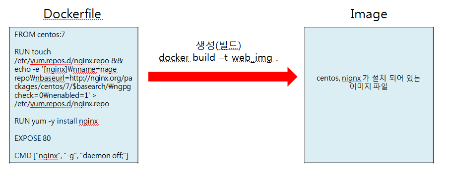 centos7을 사용중이신분들을 기준으로 우선 build 하기 전에 mkdir /build_test 입력하여 디렉토리를 생성해주고 vi /build_test/Dockerfile를 사용하여 위의 코드를 입력 후 저장 해주세요. 이후 cd /build_test/ 로 Dockerfile 이 있는 경로에 접근한 후 아래 사진에 있는 명령어를 입력 합니다. (위의 코드는 간단한 centos+nginx를 설치하기 위한 코드 입니다)
