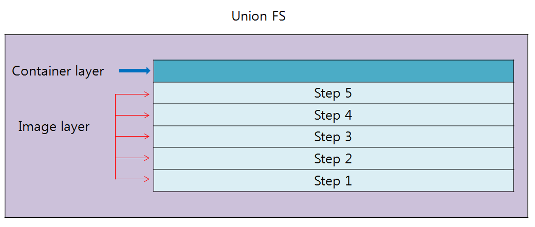 하나로 보이는 이유는 이렇게 모든 레이어들이 준비 되었다면 유니온 파일 시스템(Union File System)을 사용하여 여러개로 나누어져 있는 파일 시스템을 하나의 파일 시스템으로 마운트하여 실제 사용할때는 하나로 보이게 되고, 여러개로 나눠져 있는것을 느낄 수 없습니다.