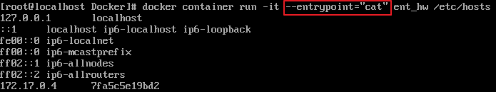 아래는 --entrypoint 옵션을 사용하여 ent_hw 이미지를 생성 및 실행하며 cat /etc/hosts 를 수행 합니다.
