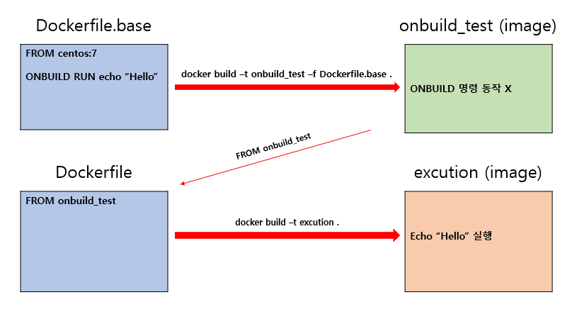 ONBUILD 명령을 사용했던 이미지를, 다른 Dockerfile에서 FROM image를 사용하여 빌드 했을 때 동작 합니다.