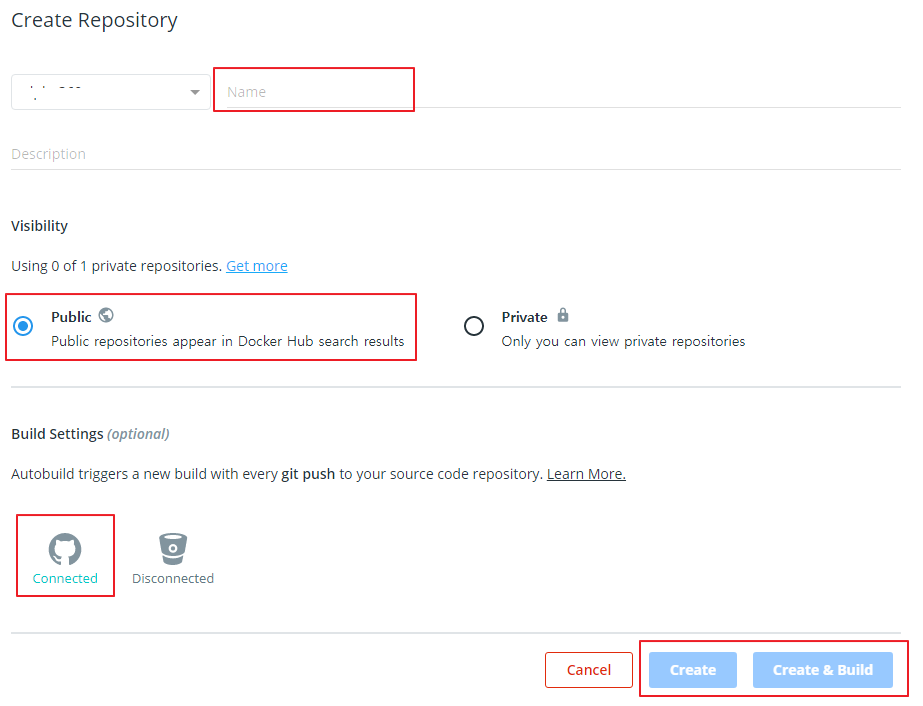 http://hub.docker.com 에 접속하여 로그인 후 상단의 Repositories → Create Repository 클릭 합니다.