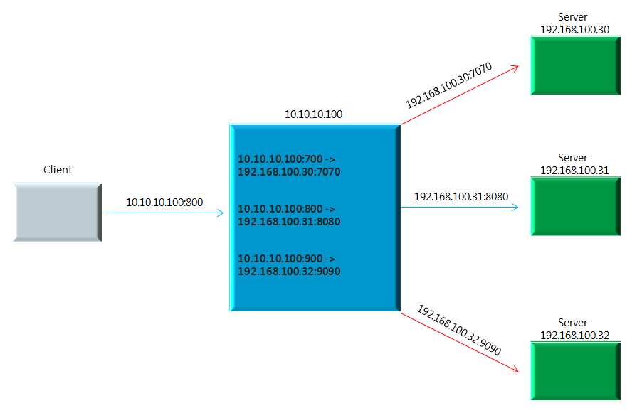 netsh interface portproxy add v4tov4 listenport=800 listenaddress=10.10.10.100 connectport=8080 connectaddress=192.168.100.31