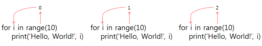 아래 그림과 같이 range(10)은 0부터 9이므로 맨 처음 숫자인 0을 꺼내서 i로 넣습니다. (변수로 활용 가능 합니다)