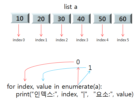 아래 코드와 같이 for 반복문으로 인덱스와 요소를 같이 출력할때엔 enumerate를 사용 하시면 됩니다. enumerate(리스트)를 입력하여 각각의 인덱스와 요소를 두 변수에 할당 합니다.