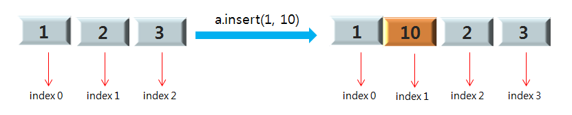 insert는 요소를 리스트의 원하는 위치에 추가할 수 있으며 insert(인덱스, 추가할 요소) 으로 사용 합니다. 아래 사진은 a.insert(1, 10)을 입력(리스트 a의 인덱스 1에 요소 10을 추가)한 예시 입니다.