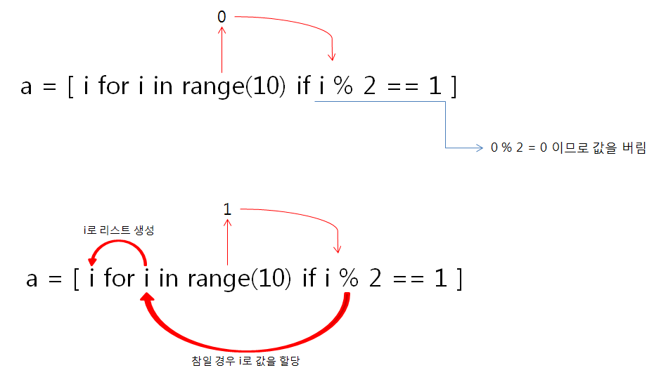 파이썬의 리스트는 리스트 안에 for문과 if문을 사용할 수 있는데, 이것을 리스트 표현식이라고 부릅니다. 아래 코드는 리스트 표현식으로 for문과 if문을 활용하여 0~9의 숫자 중 홀수만 리스트 a 로 만듭니다. (아래에서는 for문과 if문을 같이 사용 했지만 꼭 같이 사용할 필요는 없습니다)