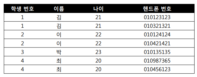 - 갱신 이상 : 학생 번호가 3번인 학생이 2학년이 되어 학년 정보를 변경 하려 하는데 3개를 모두 하나씩 바꿔줘야 함, 하나라도 안바꿀 경우 한명의 학생에 대한 정보가 서로 달라지는 정보의 모순성이 발생