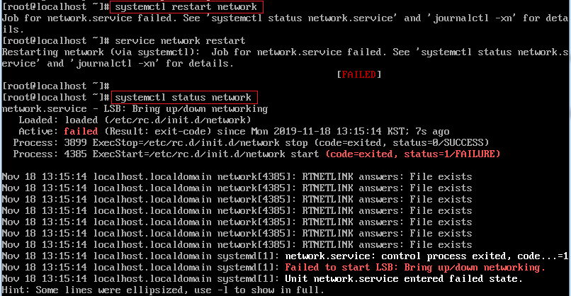 network restart 시 Failed가 발생하게 되고 systelctl status network 명령어를 통해 "Failed to start LSB: Bring up/down networking" 에러가 발생한것을 확인할 수 있습니다.