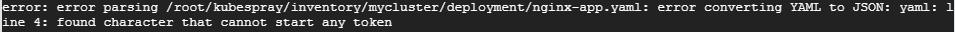 쿠버네티스 YAML 파일 들여쓰기 에러(error: error parsing /root/kubespray/inventory/mycluster/deployment/nginx-app.yaml: error converting YAML to JSON: yaml: line 4: found character that cannot start any token)는 YAML 파일을 apply 하거나 할 때 발생할 수 있습니다.