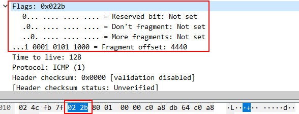 그럼 우선 0x022b 에서 0x0까지는 정체를 알아 냈습니다. 그럼 나머지 22b에 대해 알아봐야 할텐데, 이 값은 Fragment offset의 2진수 값을 16진수로 변환 후 나누기 8을 하면 됩니다.