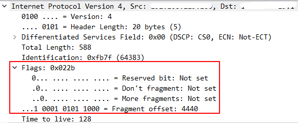 이렇게 값이 나오는 이유를 확인하기 전에 IPv4 Header 구조를 간단히 확인할 필요가 있는데 Flags 필드는 3bit, 그리고 Fragment Offset은 13bit를 사용하고, 와이어샤크에서 출력되는 Flags의 필드는 Flags+Offset 필드를 합친것 이라는 겁니다.