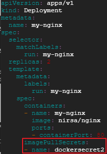 - spec.template.spec.ImagePullSecrets.name → 어떤 name을 가진 secret을 참조할 지 설정하는 부분 입니다. 이후 커맨드를 통해 생성할 name을 지정하게 되는데, 우선 저는 dockersecret으로 설정 하였습니다.