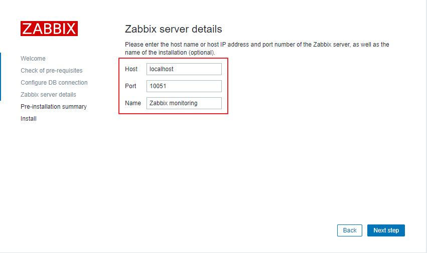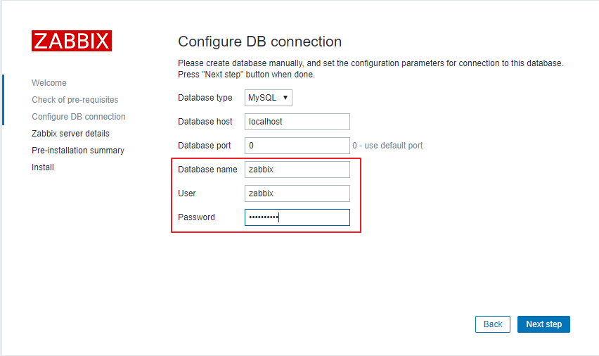 아래와 같이 입력 후 Password는 mysql에서 생성한 zabbix 계정의 패스워드를 입력 후 Next step을 클릭 합니다.