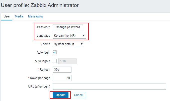 Language를 korean (ko_KR) 로 변경 및 Change password 클릭 후 사용할 패스워드 입력 시 Admin 계정 패스워드 변경