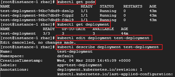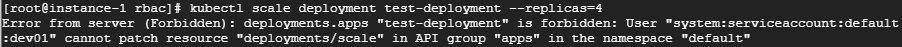 이제 role-dev.yaml 에서 입력했던 get, edit와 pods, deployment는 정상적으로 사용할 수 있어야 합니다.