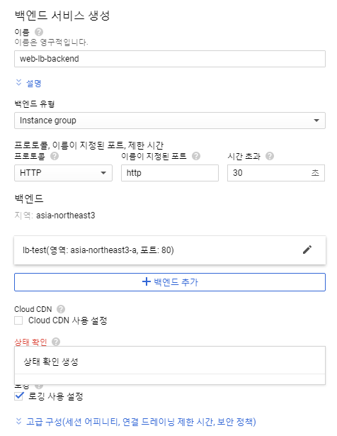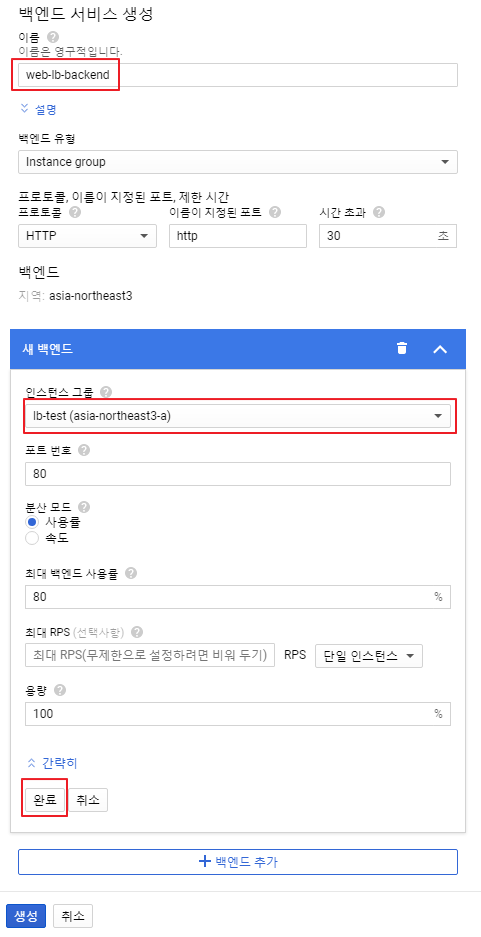 - 5-2. 이름을 설정하고 새 백엔드 창에 위에서 생성했던 인스턴스 그룹을 선택 후 완료를 눌러서 설정을 저장 합니다.
