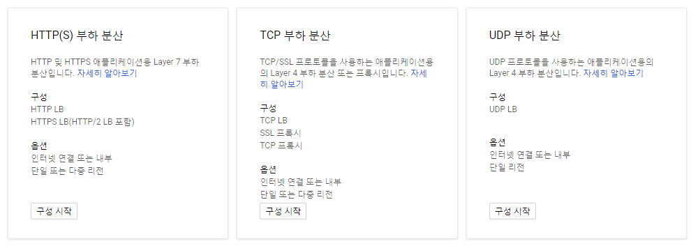 - 3. 원하시는걸 클릭하셔서 구성 시작 하시면 되고, 저는 웹 서버를 로드밸런싱할 예정이므로 HTTP(S) 부하 분산으로 구성을 시작 하겠습니다.