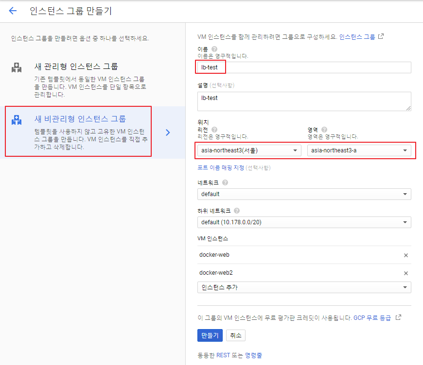- 새 비관리형 인스턴스 그룹 → 이름 작성, 리전 설정 후 하단에 로드밸런싱 설정할 VM 인스턴스를 설정하고 완료를 눌러서 생성 해줍니다. 저는 웹서버 2대를 설정 했습니다.