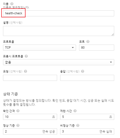 - 5-3 이후에 상태 확인을 클릭하면 "상태 확인 생성"이 보이는데, 이걸 클릭 후 만듭니다. 저는 별다른 설정 없이 이름만 설정한 후 생성 했습니다. 이후 설정은 없기에 생성을 눌러서 완료해주면 "백엔드 구성"과 "호스트 및 경로 규칙"이 정상적으로 생성 됩니다.