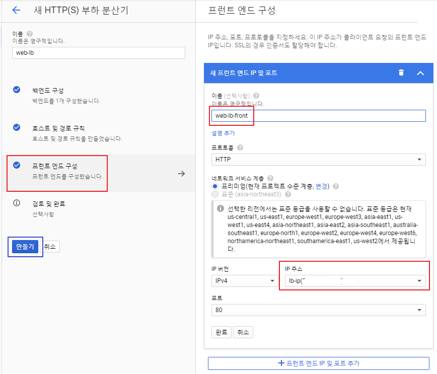 - 5-4. 프런트 엔드 구성을 클릭하여 이름을 설정하고, IP 주소란을 클릭하여 위에서 만들었던 고정IP를 사용하도록 설정 하였습니다. 모두 완료한 후 만들기를 클릭하여 설정을 마칩니다.