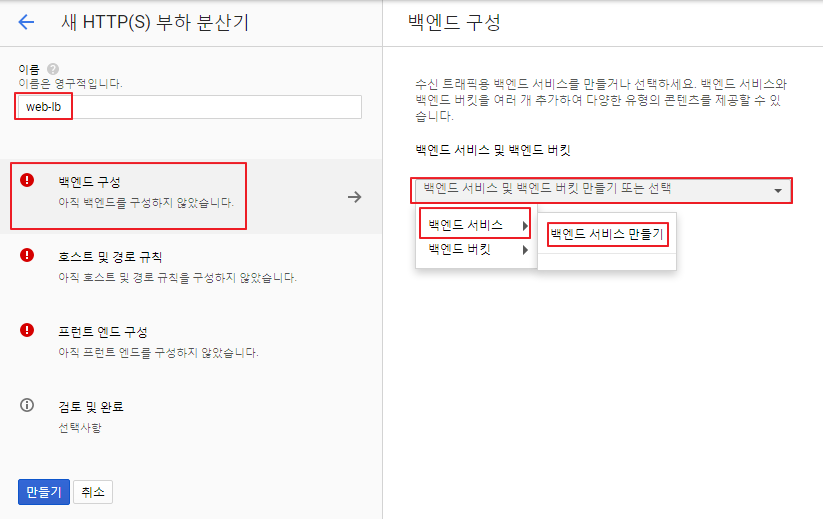 - 5-1. 로드밸런싱 이름을 작성하고 백엔드 구성을 클릭 합니다.