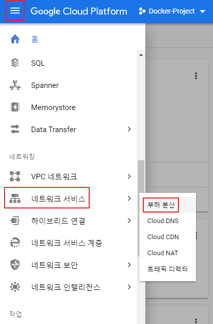 - 1. 구글 클라우드 콘솔창에 진입 후 아래 이미지와 같이 네트워크 서비스 → 부하 분산을 클릭 합니다.