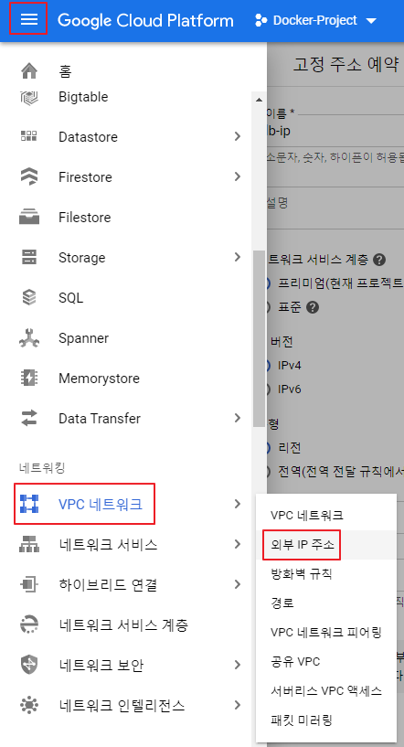 - 1. 구글 클라우드 콘솔창에 진입 후 VPC 네트워크 → 외부 IP 주소를 클릭 합니다.