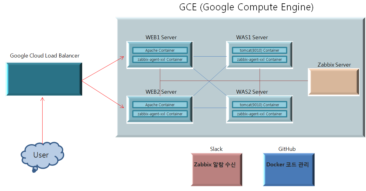 - Docker-CE, docker-compose (container : tomcat, zabbix-agent-xxl)