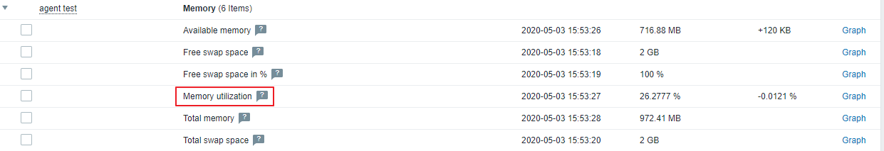 자세히 봐야할 부분은 아래에 빨간 박스를 친 부분 입니다. Memory라는 Zabbix의 Application에서, Used memory %라는 item을 가져오도록 설정되어 있습니다.