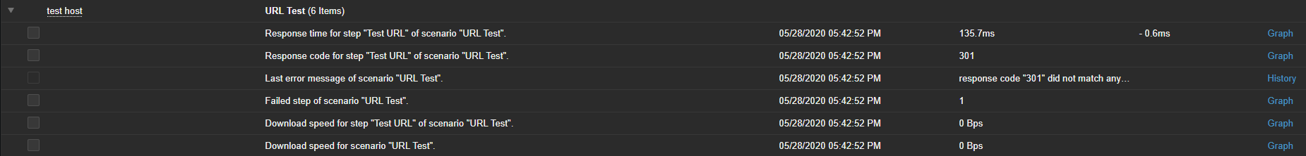 이후에 해당 호스트의 Latest를 들어가서 보면 응답 시간, 응답 코드, 마지막 에러 메세지, 실패 개수, 다운로드 속도를 확인할 수 있습니다. 아래 이미지에서 실패가 1개인 이유는 step 설정에서 Required status codes를 200으로 입력하여 200코드를 정상으로 간주하는데, 응답받은 코드는 301이기에 실패로 간주된 것 입니다.