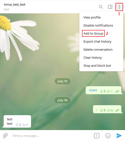 생성한 텔레그램 채팅봇 개인 메세지 우측 상단에 메뉴 버튼을 클릭 후 Add to Group을 클릭 해주세요.