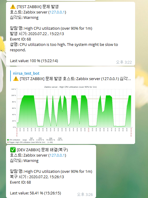 # python3 /usr/lib/zabbix/alertscripts/zbxtg.py "@[봇 이름]" "제목" "내용"