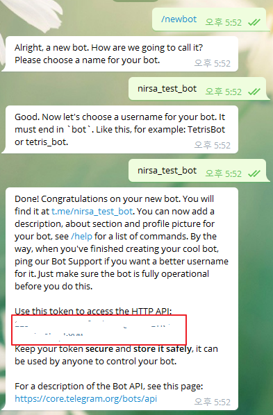 * fatherbot에게 받았던 코드를 입력하는 앞단에 "bot" 이라는 단어가 들어가야하니 주의 해주세요.