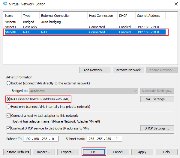 - 6) 생성된 VMnet8 클릭 후 Host-only에서 NAT로 변경 후 저장