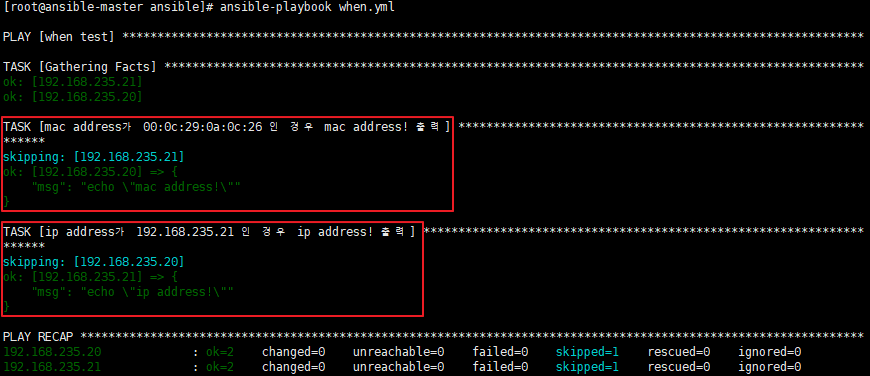 이후 ansible-playbook when.yml 명령을 이용해 해당 yml을 실행시켜보면 mac address가 00:0c:29:0a:0c:26인 경우 21번 서버는 해당되지 않으므로 skipping이 발생, 20번 서버는 mac address가 일치하므로 echo "mac address!" 가 실행 되었습니다.