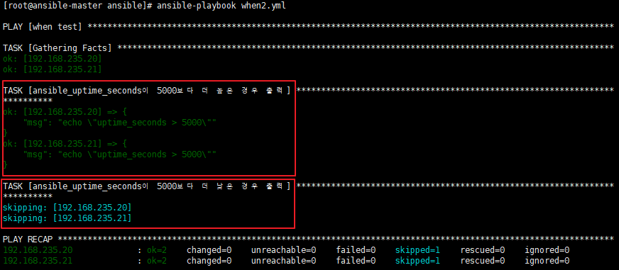 ansible-playbook when2.yml 명령어르 실행해주면 5000 이상이므로 uptime_seconds > 5000이 출력되었고, 낮은 경우는 skipping이 발생한것을 확인할 수 있습니다.