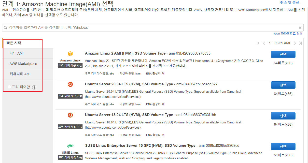 - 빠른 시작 : AWS에서 제공되는 기본 이미지들이 있습니다.