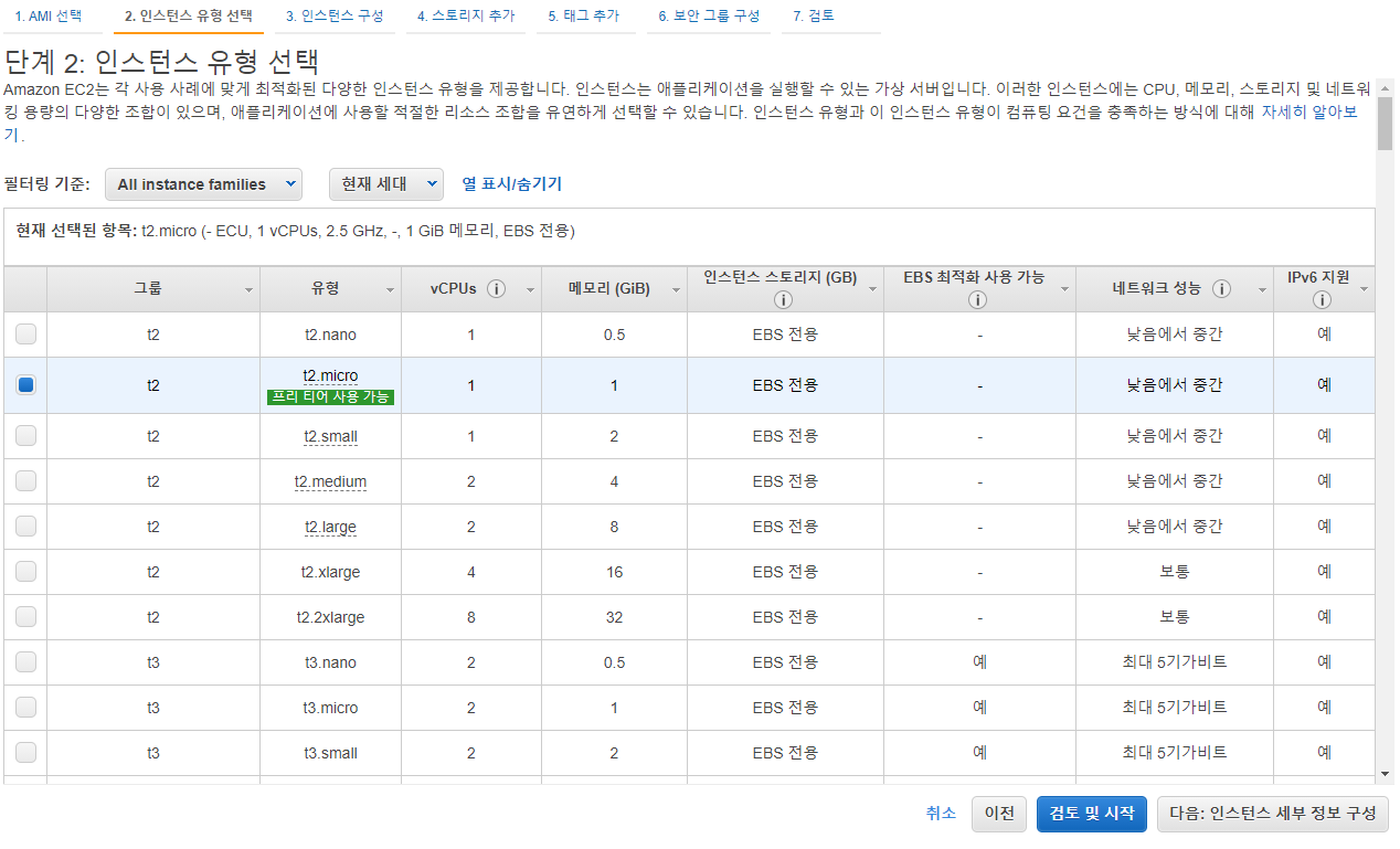 여러가지 인스턴스 유형들을 선택할 수 있습니다. 자신의 환경에 맞는 유형을 찾아 생성해야하고, 저같은 경우 프리티어로 이용중이기 때문에 t2.micro를 선택 하였습니다.