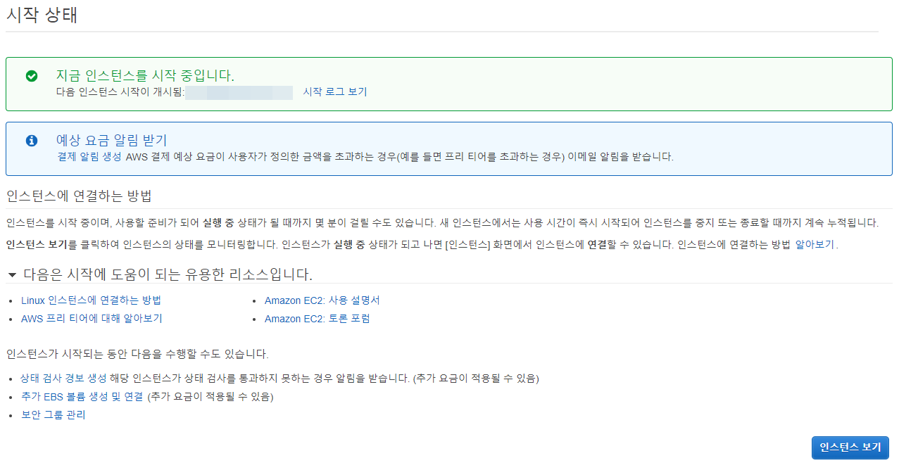 키 페어 생성 후 인스턴스를 시작 했다면 아래와 같은 화면을 볼 수 있습니다. 우측 하단의 "인스턴스 보기" 버튼을 클릭하면 인스턴스 메뉴로 다시 넘어가지면서 실행중 상태인것을 확인할 수 있습니다.