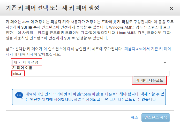 * 키 페어는 추후 인스턴스에 SSH 연결을 할 때 필요하기 때문에 잘 보관하고 있어야 합니다.