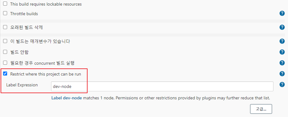 다음과 같이 프로젝트의 구성에서 "Restrict where this project can be run'을 클릭한 뒤 Label을 입력 해줍니다. Label은 노드를 추가할 때 작성했던 내용이니 기억이 안나신다면 노드 설정으로 들어가 확인 또는 추가 하시면 됩니다.