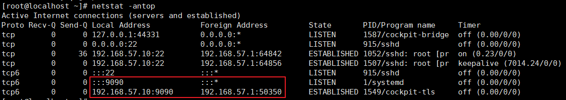 netstat -antop로 확인해보면 9090 포트가 열립니다.