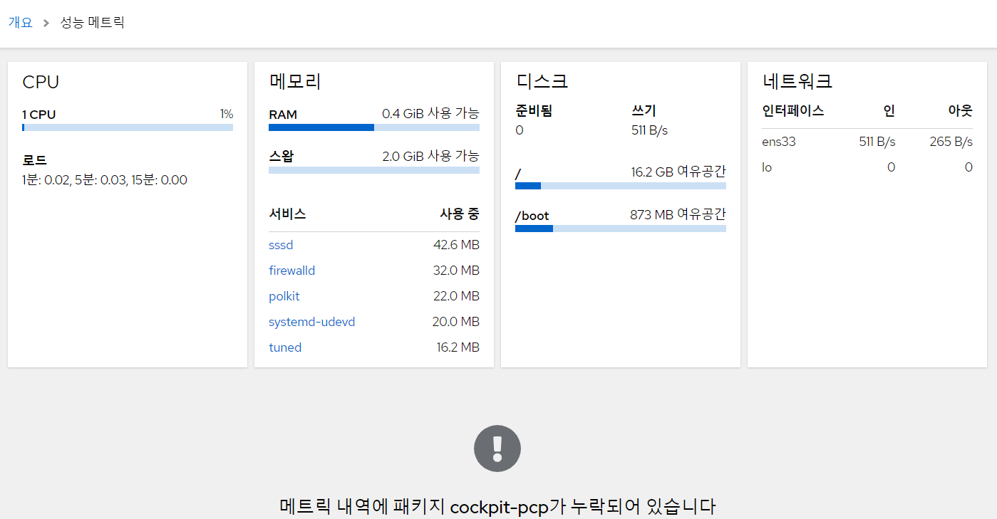 - 사용량 : 서버의 리소스 사용량에 대한 내용 입니다. "세부 정보 및 내역 보기"를 클릭하면 개요 → 성능 메트릭 으로 이동 됩니다. 소메뉴 같은데 웹상에서는 보이지 않네요. 어떤 서비스가 메모리를 사용중인지, 디스크 용량과 쓰기, 네트워크 인터페이스와 인/아웃 패킷이 추가적으로 보입니다. "참고 1-3"에서 확인할 수 있습니다. cokpit-pcp가 누락되었다고 뜨는데, 모니터링 기능이 추가되는걸로 보입니다.