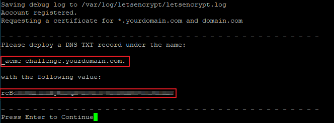 아래는 예시 화면 입니다. "rcB~~"의 토큰을 _acme-challenge.yourdomain.com. 도메인의 TXT 레코드로 등록 해줍니다. (토큰 값은 매번 다릅니다) 등록 후 약 2~3분이 지나고 TXT 레코드가 잘 등록 되었는지 확인 후 엔터를 눌러 진행하면 발급이 완료 됩니다.
