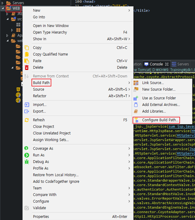 Build Path의 문제일 경우 자신의 디렉터리 구조에 맞게 변경해야 합니다. (ex. WEB/webapp/WEB-INF/classes)