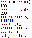 x = input() 입력 후 아무 숫자를 입력하고 type(x)로 변수 x에 들어있는 타입을 확인해 보세요. str(문자열) 형태로 나옵니다. 두 값을 더할때도 문자열로 인식하기 때문에 300이 아닌, 100+200으로 출력이 됩니다.